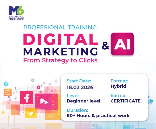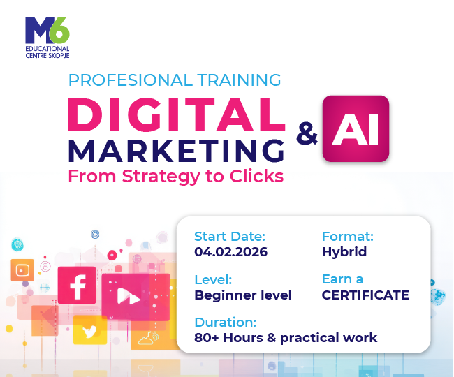 | Зошто да учите дигитален маркетинг во м6 Become a social media guru and a savvy digital marketeer with the training in Digital Marketing. You will have the chance to learn from experienced professionals who work on daily basis with big clients like Coca-Cola Company, A1 Macedonia, Heineken, Skopsko, Pandora, L’Oreal, Porsche Macedonia, Alkaloid and…