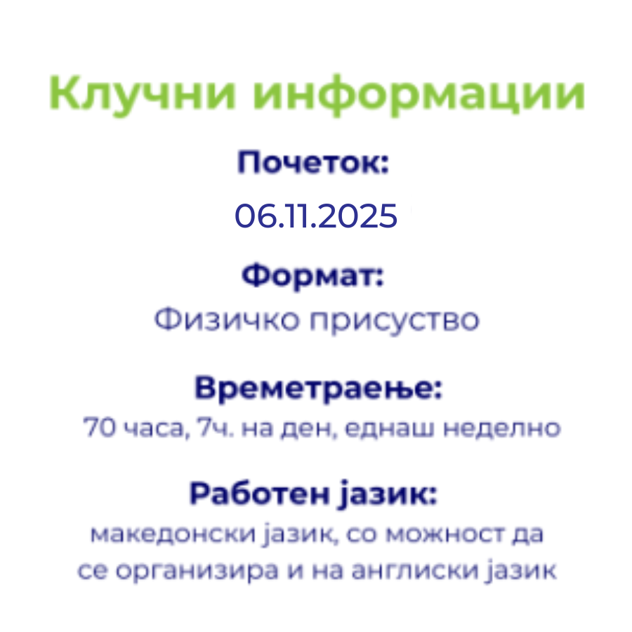 • 5 модули, 10 дена предавања, еднаш неделно